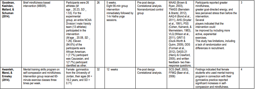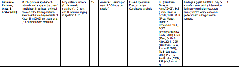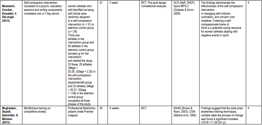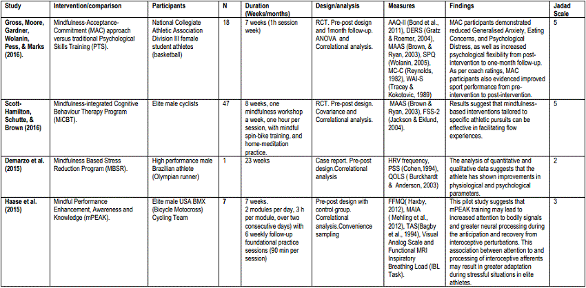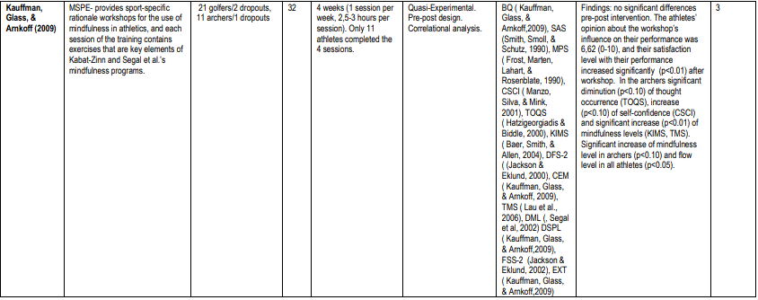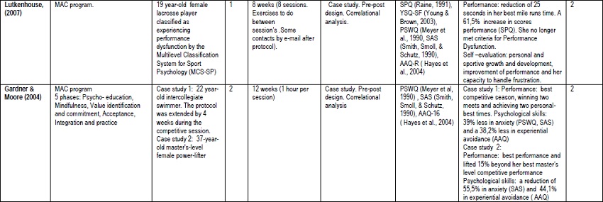 To our knowledge, in the present literature review we found eigth empirical studies conducted with MAC program (Bernier, Thienot, Codron, Fournier, 2009; Bertollo, Saltarelli, & Robazza, 2009; Gardner & Moore, 2004, Gross et al., 2016; Lutkenhouse, 2007; Mahoney & Hanrahan, 2011; Ruiz & Luciano, 2012; Schwanhausser, 2009), seven studies with adapted MBSR (Aherne, Moran, & Lonsdale, 2011; Awamleh, Mansi, & Ermeley, 2014; Bernier, Thienot, Pelosse, Fournier, & Jean, 2014; Scott-Hamilton, Schutte, & Brown, 2016; Demarzo et al., 2015; Goodman, Kashdan, Mallard, & Schuman, 2014; Haase et al., 2015), and two with MSPE ( Kauffman et al., 2009; Thompson et al., 2011), that investigate mindfulness-based interventions with athletes.