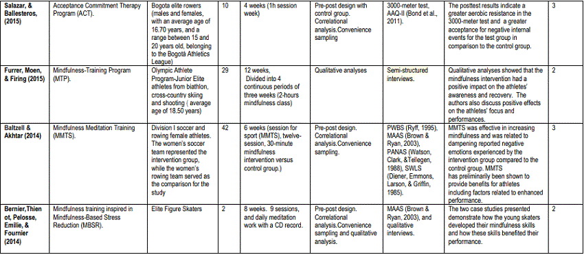 The 26 papers included in this systematic review comprised a total population size of 713 athletes, made up of 510 males and 203 females. The elite sports on the samples are basketball (Aherne et al., 2011; Bernier, Thienot, Codron, & Fournier, 2009; Gross, Moore, Gardner, Wolanin, Pess, & Marks, 2016; Franco, 2009; Kauffman, Glass, & Arnkoff, 2009), springboard (Schwanhausser, 2009), tennis, swimming, handball, volleyball (Gardner & Moore, 2004; Franco, 2009), golfers (Thompson, Kaufman, De Petrillo, Glass, & Arnkoff, 2011), skaters (Bernier, Thienot, Pelosse, & Jean, 2014), American football (Goodman, Kashdan, Mallard, & Shuman, 2014), soccer (Mahoney & Hanrahan, 2011; Baltzell & Akhtar, 2014; Franco, 2009), rowing (Baltzell & Akhtar, 2014; Salazar & Ballesteros, 2015), biathlon, skiing, shooting (Demarzo, Oliveira, Silva, Lessa-Moreno, Barceló, & Garcia-Campayo, (2015; Furrer, Moen, & Firing 2015), bicycle BMX and motocross (Haase et al., 2015), Lacross (Lutkenhouse, 2007), chess ( Ruiz, & Luciano, 2012), power-lifting (Gardner & Moore, 2004), squash and sailing (Mahoney & Hanrahan, 2011), Pentathlon (Bertollo, Saltarelli, & Robazza, 2009), and cycling (Scott-Hamilton, Schutte, & Brown, 2016).