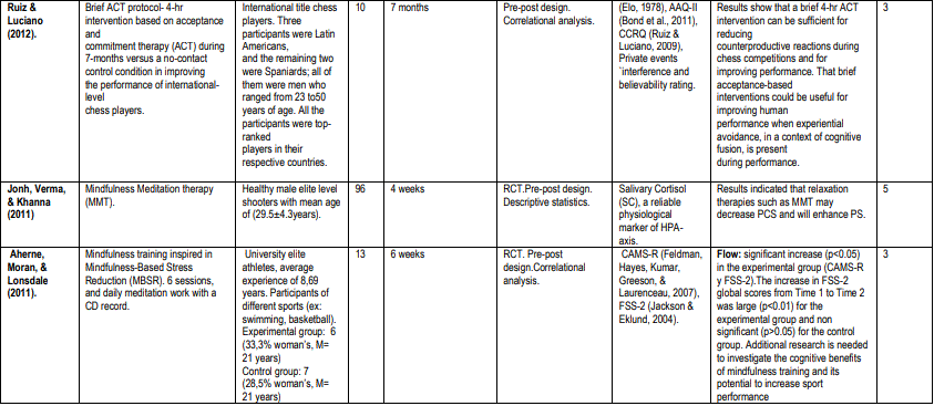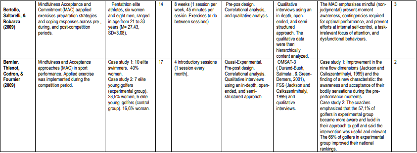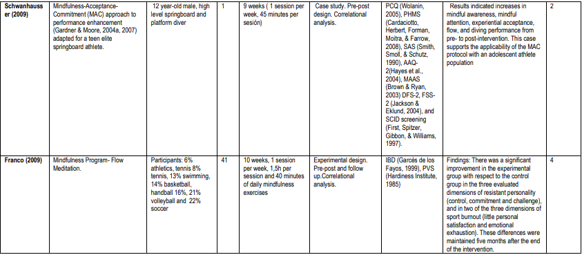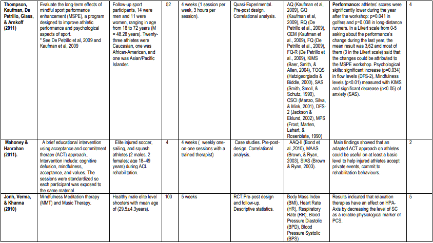 The use of mindfulness in sports psychology is very new and it’s been focused in enhancing athletes’ performance (Birrer et al, 2012) In our review we observed the next following findings: there are a few number of studies, with little samples and most of them are nonrandomized studies. We also find three case studies. Most of them use two new mindfulness-based interventions: MSPE and MAC, with a very well defined intervention protocols.