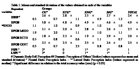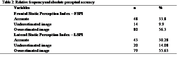 Considering that the zero value represents accurate body perception, it was possible to establish that participants were generally more accurate in their perception of static images (FSPI and LSPI) (Table 1). Table 2 shows that, in more than 50% of the sample, there was a tendency to overestimate, although some subjects showed accuracy and underestimation in their body self- perception.