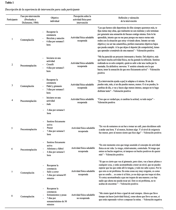 En el momento del seguimiento, siete de las ocho participantes relataban que habían recuperado la práctica de actividad física saludable (ver Tabla 1). En general, las participantes consideraron que la intervención había sido útil para identificar y discutir sus pensamientos, emociones y conductas ante la actividad física, así como para fomentar un diálogo interno más funcional. Por ejemplo, la Participante 5 comentó que “el pensamiento es pesado... [la intervención] me ha ayudado a identificar por qué me pasan cosas y a buscar una motivación y unos objetivos. Me ha hecho reflexionar sobre cuánto puede influir la autoexigencia negativa y destructiva". Además, la Participante 4 señaló “me ha ayudado a despertar un poco. Me parece muy útil porque hace pensar. El trabajo de escribir qué haces y dices, qué no, las sensaciones que tienes, las consecuencias… me ha ido bien, emocionalmente ha sido muy positivo”. Sin embargo, la Participante 8 indicó que “yo no me planteo por qué no he ido, simplemente no voy”.