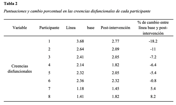 La investigación con DCUI con frecuencia suele utilizar el análisis visual para establecer conclusiones sobre los cambios en las variables objetivo y para priorizar la importancia práctica de los datos sobre la significación estadística (e.g., Chrysidis et al., 2020; Kazdin, 2011). El análisis visual incluye cuatro pasos para determinar la efectividad de la intervención: (a) la inmediatez del efecto después de la intervención, (b) los efectos replicables entre participantes, (c) los puntos de datos solapados entre la recogida de datos de la línea base y la del seguimiento, y (d) la magnitud del cambio porcentual desde el inicio hasta la fase de seguimiento (ver Turner et al., 2020). El análisis visual de los datos (ver Tabla 2) permite observar una disminución de las creencias disfuncionales en seis de las ocho participantes entre la línea base y la post-intervención, mientras que se observa un incremento en creencias disfuncionales en dos de las ocho participantes. En cuanto a la magnitud del cambio, dos de las participantes muestran una disminución de creencias disfuncionales por encima del 10% de variación; tres presentan una disminución entre el 5 y el 7%. Por el contrario, dos de las participantes muestran un incremento de creencias disfuncionales entre el 5 y el 8% de variación. Para la participante 6 la intervención no parece tener ningún efecto en cuanto a sus creencias.