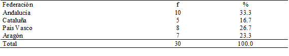 En el estudio participaron un total de 30 deportistas federados seleccionados de manera intencional (76.7% hombres y 23.3% mujeres) que participaron en competición deportiva oficial en el año 2019, con una edad media de 16 años (edad mínima: 12, edad máxima: 21). Las personas fueron seleccionados de forma intencional no probabilística por el único motivo de facilidad de acceso, para lo que se contactó con ellas en competiciones deportivas. Pertenecen a un total de cuatro federaciones deportivas, tal y como reflejan los datos de la tabla 1.