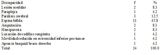 Al preguntar al grupo por la discapacidad que los ha llevado a participar de esta actividad, el 45.8% de estas personas manifestó tener espina bífida, seguido de un 12.5% con parálisis cerebral, así como un 8.3% con lesión medular, amputación y hemiparesia. Otras casuísticas que destacar son la paraplejia, la luxación de rodillas congénita, la apraxia braquial y la movilidad reducida por tumor (ver tabla 2).