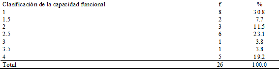 Siguiendo la clasificación de la capacidad funcional de los y las deportistas de la International Wheelchair Basketball Federation (2014), se observa que la capacidad del grupo participante es muy heterogénea, según muestran los datos de la tabla 3. La mayoría del grupo se encuentra incluido en los niveles 1 y 2, lo que lo define como un grupo con altos niveles de movilidad reducida.