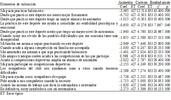 Antes de proceder a dar validez a los resultados obtenidos, se trató de comprobar que las variables están normalmente distribuidas. Si se atiende a la información aportada en la tabla 4, los valores aportados por los coeficientes de asimetría (< 3.00) y curtosis (< 8.00), dan a entender que existe normalidad univariada de los datos obtenidos (Thode, 2002) para cada elemento de medida diseñado, a excepción del primero de los elementos (me gusta practicar baloncesto), ya que refleja una tendencia positiva en su respuesta en todos los casos considerados. Asimismo, se ha establecido la bondad de ajuste del modelo estadístico que subyace a las observaciones realizadas y las consideradas como deseables, asumiendo en los valores escalares un carácter discreto mediante la prueba de chi cuadrado (n.s.=.05) (Rao y Scott, 1981). El contraste ha resultado ser significativo en todos los componentes del instrumento salvo en uno de ellos (mis amigos y amigas suelen acudir a las competiciones en las que participo) que se manutuvo en origen por su relevancia, lo que indica que los datos obtenidos se distribuyen a lo largo de un continuo normalizado de observaciones y con capacidad para ser generalizados a la población de referencia.