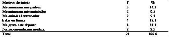En este momento, es importante aclarar qué es lo que motiva a estar personas a iniciarse en la práctica de baloncesto en silla de ruedas a nivel federado. Los datos de la tabla 5 muestran que, de las respuestas aportadas, el principal motivo de práctica es de carácter recreativo, al revelar que es un deporte que les gusta (38.1%), siendo el siguiente de carácter saludable, estar en forma (19.3%) y apareciendo en tercer lugar motivos de carácter extrínseco como el ánimo familiar (14.3%) y el apoyo de su grupo de iguales (9.5%). Los motivos deportivos (9.5%) y clínicos (9.5%) son los menos valorados. Todos ellos son considerados como factores que actúan como facilitadores de esta práctica deportiva.