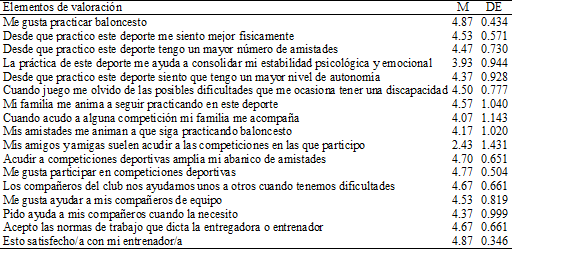 Es relevante señalar la falta de apoyo que reciben de sus amistades en la realización de este deporte, dado que no suelen acudir a las competiciones en las que participan (M = 2.43, DE = 1.431). Por el contrario, se observa que han ampliado su grupo de amistades, perciben una sensación de cooperación dentro del seno del equipo, una buena capacidad para aceptar las normas y una alta satisfacción con la labor desarrollada por el entrenador o entrenadora.