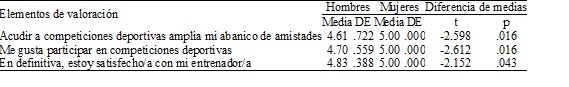 Los datos de la tabla 7 indican que solamente se encontraron diferencias estadísticamente significativas en tres elementos: acudir a competiciones deportivas amplía mi abanico de amistades [t(28 )= -2.598], p= .016), me gusta participar en competiciones deportivas [t(28) = -2.612, p = .016] y estoy satisfecho/satisfecha con mi entrenador/entrenadora [t(28) = -2.152, p = .043], donde la media de valoración de las mujeres es más elevada. El análisis ha revelado una mayor capacidad de las deportistas para ampliar su círculo de amistades gracias a la práctica del baloncesto en silla de ruedas, así como un carácter competitivo más elevado y una mayor satisfacción con el trabajo realizado por su entrenador o entrenadora.