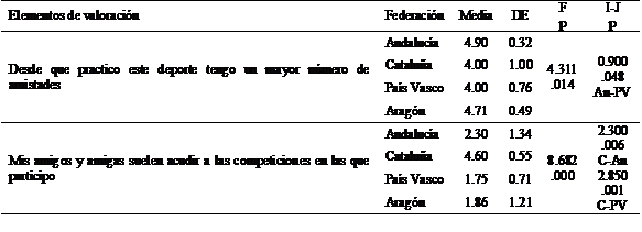 Por su parte, el grupo de la Federación Catalana percibe, a diferencia de los equipos de Andalucía y el País Vasco, que sus amistades suelen acudir a las competiciones en las que participan [F(2,29)=8.682, p=.000], lo que refleja el apoyo percibido por los grupos de iguales para con el colectivos de personas con discapacidad.