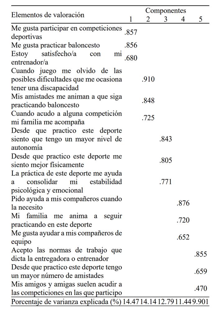 El primer factor, denominado “satisfacción con la práctica deportiva”, aporta una explicación de la varianza del 14.47%. El mismo alude a los beneficios recreativos que supone el baloncesto en silla de ruedas para su desarrollo integral, donde el papel del entrenador o entrenadora es entendido como fundamental.