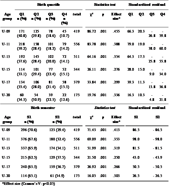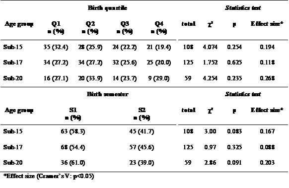 There were no significant differences between the male and female sexes in the birth quartiles in the U-15 (χ²=1.307; df=3; p=0.438); U-17 (χ²=3.904; df=3; p=0.272) and U-20 (χ²=1.107; df=3; p=0.775) categories. There were also no significant differences between sexes in each category if one takes into consideration the semester of birth (U-15: χ²=0.603; df=1; p=0.727; U-17: χ²=3.150; df=1; p=0.076; U-20: χ²=0.326; df=1; p=0.568).