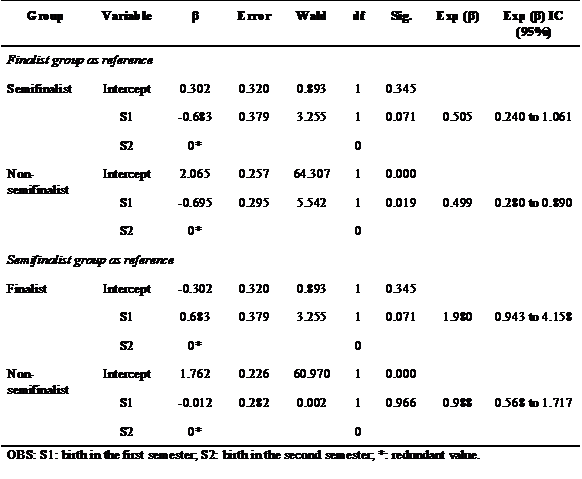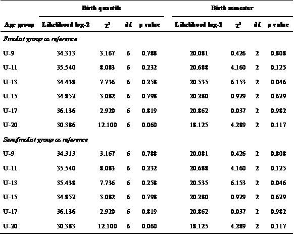 The multinomial logistic regression models were run independently for each category by taking into account the performance of each team in the competition in comparison to the number of athletes born in each quartile or semester. This stage only considered information of male athletes, given the non-RAE of female athletes. The adjustment and likelihood ratio test of the models were not significant in almost all cases (Table 3). Category U-13 was the only exception when the dummy variables of the semester of birth were observed. There was 50% chance of athletes born in the first semester to be among the finalists in the competition in comparison to athletes who were born in the second one, when it comes to belonging to one of the teams that were not classified to the semifinals in the same competition (Table 4). The model based on teams in the semifinal group also presented significant likelihood ratio test for the U-13 category (Table 3); however, the significant values recorded in the Wald test highlighted that the β value was not different from zero in any of the two groups in comparison to the reference group (Table 4), thus, the model cannot be interpreted.