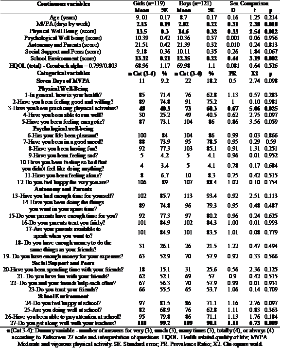 Table 1 presents the sample characteristics for girls and boys. Boys showed significative higher levels of MVPA per week, and physical well-being compared to girls. About 9.2% of girls and 22% of boys reached seven days for MVPA. Otherwise, girls have a higher quality of life in the school environment domain compared to boys. The categorical Kidscreen variables showed that boys have been practicing physical activities in a superior proportion (20%) than girls. Boys present 33% more chance to have been practicing physical activities compared to girls, while girls get along well with teachers in 1.11 times more probability than boys.
