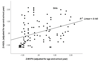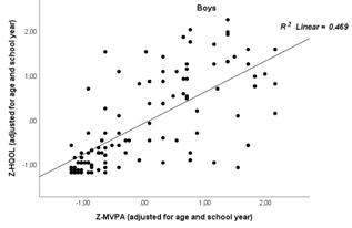 Figures 1 and 2 showed data distribution in scatter dot graph and linear correlation of MVPA and HQOL total z-scores, adjusted by age and school grade. It was found that these variables are positively associated, with stronger explanation in boys (46.9%) than girls (14.5%).