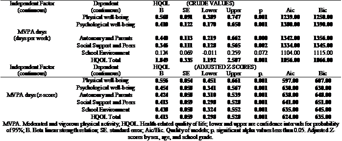 Finally, the association between physical activity and quality of life was measured considering crude variable values in generalized linear models (GLM), and adjusted z-scores of days of MVPA and HQOL total and domains for sexes, age and school grade. We calculated linear explanation (R2) of moderate to vigorous days per week of physical activity (Z-MVPA) correlated with health-related quality of life (Z-HQOL) with scatter dots of linear regression adjusted for age and school grade. Then, the relationships between MVPA days and HQOL domains in sexes considering adjustment for beta weights of age and school grade were estimated in generalized linear models (GLM). Beta represents the strength of relationships, lower values of Aic and Bic are indicators for the best GLM models. GLM models were selected due to being a robust method, considering versatility, power, and elevated types of scales for statistical calculations. For all analyses, we adopted an alpha of less than 5%. The software SPSS 24.0 was used for all analyses.