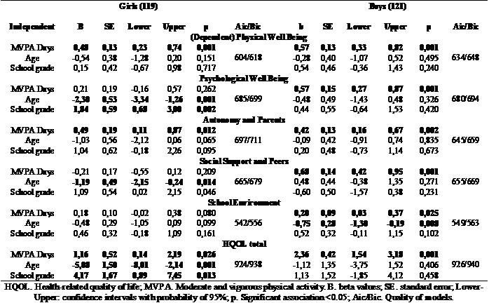 MVPA days and psychological well-being were not associated with girls, because age was negatively correlated with psychological well-being, and school grade was positively related with more strength on this variable. Otherwise, for boys this association was significant, age and school grade were not associated with psychological well-being. A similar effect of relation was found for social support and peer’s domain. Therefore, only age was negatively associated with this HQOL domain in girls. In boys, MVPA was strongly and positively associated with social support and peers. MVPA was associated with the school environment domain only in boys, and age was correlated with less HQOL in this domain. In girls, no significant associations were found.