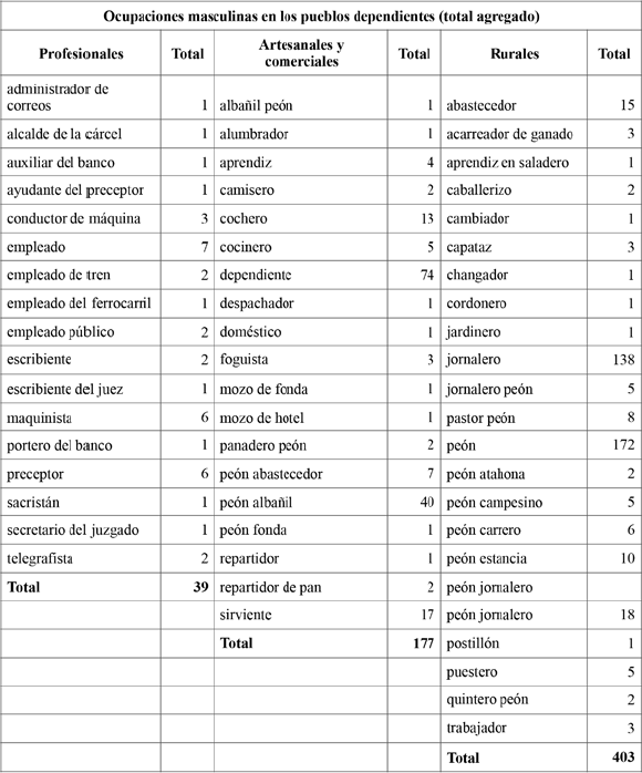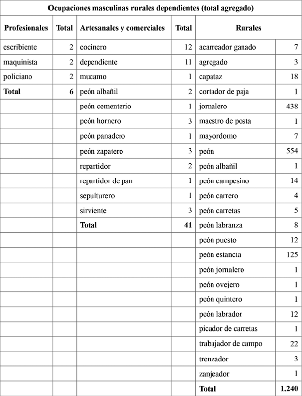 Mucho se ha escrito y discutido a propósito de las categorías profesionales y los conceptos que se pueden esconder detrás de las distintas denominaciones. En el caso de los censos, particularmente parcos y concisos, estos interrogantes se plantean con especial fuerza. ¿Las categorías son las declaradas por el entrevistado o responden a las impresiones (y prejuicios) del encuestador? ¿Los términos “peón” y “jornalero” corresponden a conceptos precisos y distintos? Esta cuestión dio lugar a un debate ya clásico en los años noventa, que se ha renovado regularmente hasta la actualidad (AAVV, 1987; Fradkin, 1993, pp. 17-58; Gelman y Santilli, 2014) y que no retomaremos aquí, por lo cual remitimos a la bibliografìa respectiva. En todo caso, siempre habrá un ineludible margen de interpretación en este ámbito, por lo cual hemos procurado conservar las categorías tal como las presenta el censo.