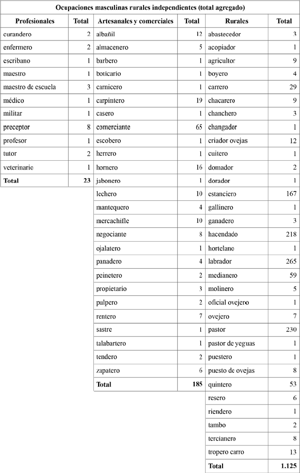 En cuanto a las ocupaciones, hemos podido constatar, como era de prever, el predominio de las actividades rurales entre los hombres y de las tareas domésticas (sobre todo costureras y lavanderas) entre las mujeres. En las tareas rurales se destacaron peones, jornaleros, estancieros y labradores, aunque también se incluían una enorme cantidad de oficios rurales, como reseros, acarreadores o abastecedores. Hay que recalcar que tanto las actividades agrícolas como las artesanales podían ofrecer una vía de inserción eficaz para los extranjeros.