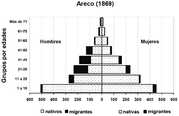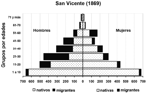 Desde el punto de vista general, la población argentina en 1869 puede ser descrita como una sociedad típica del Antiguo Régimen: equilibrio de sexos, importante proporción de niños debido a la fecundidad natural y rápida disminución del tamaño de los grupos en las cohortes subsiguientes por la fuerte incidencia de la mortalidad. Como veremos posteriormente, si nos detenemos en las regiones y observamos los partidos, el equilibrio de sexos no era tal. La relación de masculinidad en la provincia de Buenos Aires y en el Litoral era positiva, mientras que en el Interior y sobre todo en el Noroeste del país, la relación era negativa. Es decir, desde el interior se expulsaba a la población masculina, que era absorbida por las regiones del Litoral y Buenos Aires. A la estructura poblacional general se agregaron los inmigrantes, en especial los extranjeros varones mayores de 15 años (Otero, 2006). De acuerdo con los datos del censo, el 19,2% de la población de la provincia de Buenos Aires era extranjera; con un 90% de europeos, de los cuales una tercera parte eran italianos, seguidos por españoles y franceses (Masse, 2012, p. 163).