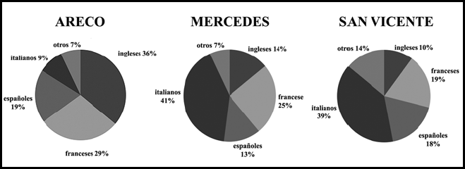 El progresivo reemplazo de las corrientes migratorias internas por la afluencia de inmigrantes europeos se vuelve particularmente visible a partir de este censo: Italia, España, Francia e Inglaterra son los países que aportaron los mayores contingentes. Los gráfico 4, 5 y 6 expresan cómo las corrientes estuvieron presentes en los tres partidos, pero tuvieron una distribución diferenciada. Los ingleses adquirieron más peso en Areco; mientras que en Mercedes y en San Vicente la corriente principal fue la de los italianos, seguida por los franceses. Los españoles ocuparon, respectivamente, el tercer y cuarto lugar en importancia en los últimos dos partidos. Los itinerarios que siguieron los inmigrantes parecen haber obedecido a motivos de índole ocupacional, puesto que se observa que cada una de estas corrientes encontró su inserción preferentemente a través de determinadas actividades económicas. Esto refuerza el argumento de que las actividades u oficios –conjugados con las cadenas migratorias, las condiciones y las demandas locales– determinaron la distribución de los migrantes sobre el territorio.