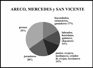 Las de peón rural y jornalero eran las ocupaciones más importantes entre los hombres mayores de 14 años (1.536 hombres), pues representaban el 37,5%. Esta cifra, como veremos posteriormente, cubría realidades bien diferentes. Por ejemplo, los peones y jornaleros eran el 47,3% de los hombres con actividad en San Vicente, tanto argentinos como extranjeros; en Areco, el 40% y apenas un 31% en Mercedes. Hacendados y estancieros eran las ocupaciones que seguían en importancia, aunque muy de lejos, puesto que representaban un 11%. Tanto entre los peones y jornaleros como entre los estancieros y hacendados los argentinos eran predominantes; también lo eran entre medianeros y tercianeros. Sin embargo, entre los labradores, los extranjeros eran mayoritarios: los italianos constituían el 60% de hombres con esta ocupación y se concentraban particularmente en el ejido de Mercedes.