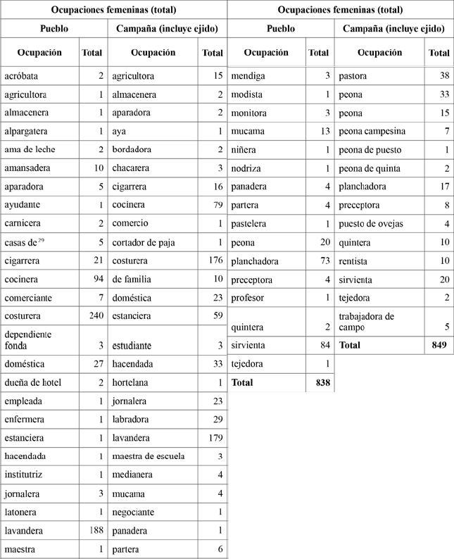 Las zonas rurales de los partidos seleccionados muestran ciertas diferencias. En Areco, el trabajo doméstico representaba un 40%, pero un 21% de las mujeres que registraron ocupación lo hicieron como estancieras y un 23% como dependientas. El resto se distribuía en ocupaciones vinculadas al comercio al menudeo y a la educación. En Mercedes, las estancieras ocupaban un porcentaje menor (15%) y casi no se registró trabajo dependiente. En cambio, las pastoras eran el 27%. En su ejido, el trabajo doméstico era plenamente mayoritario (77%), y el porcentaje restante estaba vinculado a la agricultura y tareas afines. En San Vicente, el registro pareciera tener ciertas deficiencias porque en algunos cuadernillos se anotó menor cantidad de ocupaciones femeninas, aunque igualmente variadas.