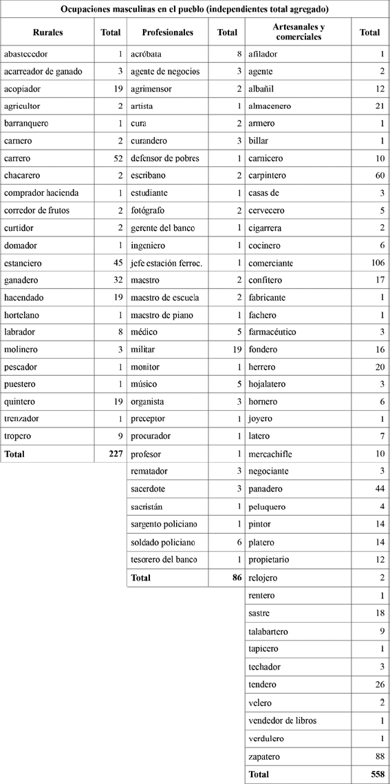 Los artesanos eran igualmente numerosos, y eran sobre todo inmigrantes. Abundaban los zapateros, herreros, plateros, lateros. En cuanto a las ocupaciones profesionales: militares, artistas (acróbatas, músicos, fotógrafos…), médicos, pero también curanderos, sacerdotes, agrimensores, escribanos y otros. Los pueblerinos que registraron actividad rural eran, entre otros, estancieros, acopiadores, carreros, quinteros, troperos y labradores.