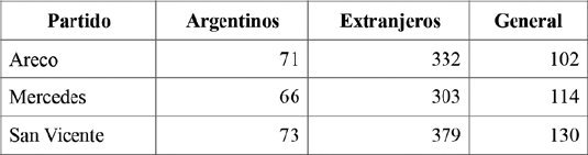 La proporción entre nativos e inmigrantes era idéntica en Mercedes y San Vicente, con un 75,3% de argentinos y un 24,7% de inmigrantes; en cambio, en Areco los extranjeros constituían el 16%. Es significativo que en los dos primeros casos los porcentajes de extranjeros superaban ampliamente el promedio provincial del censo (18,3%). Las tasas de masculinidad generales esconden algunos contrastes: si bien en Areco la tasa general de 106 hombres por cada 100 mujeres es similar a lo que se considera “normal”, entre los argentinos está por debajo de lo normal, y entre los extranjeros es extremadamente alta. Esto se acentúa en Mercedes y mucho más aún en San Vicente, donde evidentemente la presencia de hombres solteros de origen extranjero era incluso mayor que en los otros dos poblados.