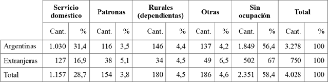 A fin de facilitar las comparaciones, hemos dividido las ocupaciones por nacionalidad y por “sectores”. Cabe aclarar que las cabezas de explotación y las dependientes son mayoritariamente rurales (estancieras, hacendadas y labradoras, jornaleras y peonas). Promediando los porcentajes de los tres partidos, el 87% de la mano de obra femenina estaba compuesta por argentinas.