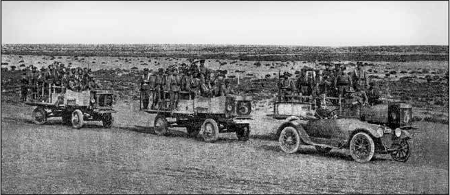 En la fotografía se observa el primer convoy militarizado en la delimitación entre Magallanes y Santa Cruz, en Cancha Carreras, enero de 1919.68
