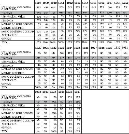 Evolución de los motivos de rechazo y el tracoma (1907-1937)