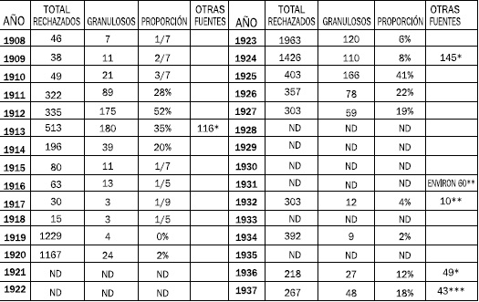 Fuente: Di Liscia M. S. (2009). Memorias de la DGM, años 1920, 1921, 1923, 1925, 1926, 1927, 1932, 1934, 1936, 1923-1927. CEMLA, Buenos Aires.Nota: *Según los Actas de Inspección Marítima, AGN/DAI. ** Según el oftalmólogo Gunther Von Grolman (1933). La profilaxis internacional del tracoma en la República Argentina. Archivos de Oftalmología de Buenos Aires, enero-febrero de 1933, 1 y 2, pp. 601-604. Biblioteca de la Facultad de Medicina, Universidad de Buenos Aires.*** Según el oftalmólogo Gunther Von Grolman (1938). La profilaxis del tracoma en los inmigrantes y la Ley 817. La Prensa Médica Argentina, año XXV, Nº14, pp. 691-694. Biblioteca de la Facultad de Medicina, Universidad de Buenos Aires.