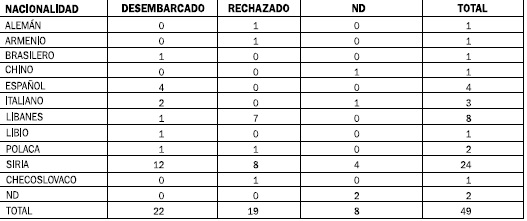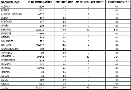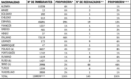 Fuentes: Memoria de la DGM, 1924. Actas de Inspección Marítima. AGN/DAI.Nota: * Sobre el total de los inmigrantes (segunda y tercera clase) llegados de ultramar en 1924. ** Sobre el total de los rechazados por tracoma. *** Total de los rechazados. Presentamos acá solo las nacionalidades afectada por el rechazo de granulosos. (a) Incluimos seis inmigrantes considerados por las autoridades argentinas como «polaco/ruso». (b) Incluimos un migrante considerado por las autoridades argentinas como «sirio/turco». (c) Incluimos dos inmigrantes considerados por las autoridades argentinas como «turco/armenio».