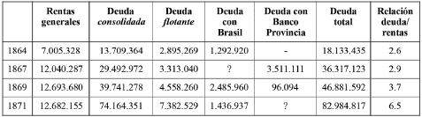 Vayamos entonces a la cuestión de la deuda en el período, problema espinoso y cuyo análisis profundo exigiría, como dijimos, otro tipo de documentación que por ahora es inexistente. Tenemos dos tipos principales de deudas: a) la flotante o exigible que es de corto plazo –del “día a día”– y que hay que pagar de manera imperiosa y en un lapso muy breve –de unos meses a dos años–, esta es justamente la que debería ser estudiada con otra documentación, pues las Memorias dan escasos detalles sobre algunos de los rubros;11 b) la consolidada de largo plazo, cuya amortización puede llegar hasta 35 años desde el momento de su inicio. A estas dos deudas principales se añaden las contraídas con el Imperio de Brasil y las referidas a los préstamos del Banco de la Provincia de Buenos Aires.