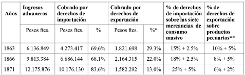 Era lógico, no se entendería en Londres que un país que necesita con urgencia recursos excepcionales para enfrentar una guerra difícil, lanzando un empréstito que lo endeuda en forma considerable, redujera los impuestos. Por supuesto, es muy probable que esta rebaja de impuestos sea la contrapartida del apoyo de los grandes terratenientes pampeanos en los inicios de las hostilidades69 (que buenos defensores tenían en el Congreso,70 pues se llegó incluso en 1865 a oponerse en la Cámara de Diputados a la continuación de los derechos de exportación, ante la estupefacción de Mitre que no podía creer que los congresales tuvieran esa posición “en los momentos difíciles por que pasa el país.”).71 La decisión mencionada por el enviado se modifica en el presupuesto siguiente y De la Riestra registra agradecido ese cambio. Sin embargo, esto se “olvida” un poco más tarde y a fines de la guerra, los ingresos originados en los impuestos a las exportaciones, en relación con los ocasionados por los impuestos en concepto de las importaciones, han descendido en forma más que evidente, siendo los más bajos desde los inicios de los sesenta. Pero, para evitar consecuencias negativas en la fiscalidad, al mismo tiempo se suben los impuestos de importación sobre las siete mercancías de consumo masivo de mayor peso en los sectores populares: yerba mate, tabaco, té, café, azúcar, aguardiente y vino.