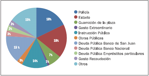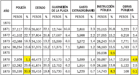 La lucha facciosa local provocó grandes erogaciones al fisco. En 1856, la suma del gasto militar y el extraordinario de guerra absorbían el 38% del gasto público. La crisis financiera se agravó por la falta de ayuda del Tesoro nacional, agotado después de la batalla de Pavón. Así, entre diciembre 1861 y abril 1862, dicha erogación representó el 77% del total del gasto público (Cordeiro y Viale, 1917, tomo 1862, pp. 47-49). Por el contrario, el período 1865-1879 se caracterizó por el descenso del gasto bélico, y como contrapartida, por el incremento de obras públicas. Como se verifica en el cuadro 1, la modernización del Estado y la especialización de la administración significaron el 30% de las erogaciones. Los gastos de Policía aumentaron paulatinamente del 10% al 31% en los años setenta. Esto se explica por el comienzo de la política de control social y laboral para el reclutamiento de la mano de obra requerida por la industria azucarera. El gobernador Belisario López hacía referencia a la importancia de la policía en relación con la riqueza de la provincia: