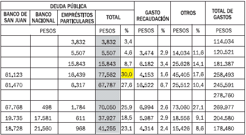 El uso del crédito produjo un incremento considerable de la deuda pública como efecto directo del recorte de las asignaciones nacionales. En 1872, se autorizó el establecimiento del Banco de San Juan, una entidad privada al servicio del gobierno. Al año siguiente, la deuda pública –las obligaciones a pagar a la entidad– representaba el 30% del total del gasto público, lo que superaba ampliamente a las demás erogaciones. En 1873, el Estado recibió la suma de casi $b72.000 (pesos bolivianos) equivalente a $F93.720 (pesos fuertes) en créditos con una tasa de interés de entre el 15 y el 18% anual, lo que significaba el 27% de los ingresos. La sucursal del Banco Nacional también se había establecido en la provincia y operaba como banco del gobierno. Un crédito de $b26.400 ($F20.000) –al 9% de interés– cubrió el pago de los sueldos de la administración (Cordeiro y Viale, 1917, tomo 1878, p. 200).