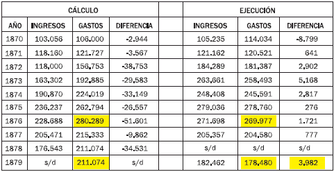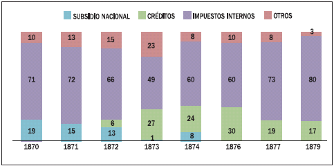 Más aún, el saldo entre gasto e ingreso se quintuplicó entre 1877 y 1879, como efecto de la doble política fiscal: control del egreso y disminución de las rentas, cuya recaudación –en especial, de impuestos directos– se vuelve más difícil en época de crisis. De este modo, el balance de las cuentas fiscales arrojó superávit en todos los años, excepto en 1870.