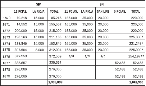 Respecto de las SIP, las fuentes no permiten conocer cuál era el monto distribuido a cada provincia. En el cuadro 4, se ha calculado que la media del reparto de los subsidios entre 1870-1875 era $F14.600; y en el período 1876-1879, ascendía a $F24.200 para cada una. Sin embargo, las remesas en el caso de Tucumán estuvieron muy por debajo de esos valores, con una media de $F6.400. Por consiguiente, se puede deducir que la distribución de SIP era en extremo arbitraria, desigual y sin criterio predeterminado, excepto para La Rioja.
