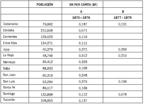 A pesar de la reducción del gasto, el Estado nacional no cesó en el envío de transferencias a La Rioja, San Luis, y Catamarca, provincias castigadas duramente por los levantamientos federales de Ángel Vicente “El Chacho” Peñaloza en 1862-1863 y por la revolución de los colorados liderada por Felipe Varela en 1866-1868. Incluso la exigua remesa de $F52.488 igualaba en algunos casos y duplicaba en otros al ingreso de SN per cápita del resto de provincias en los primeros años de la década (cuadro 5, columna B). De esta manera, se intentaba amortiguar los severos daños en la economía y contribuir a la recuperación fiscal de las provincias. La política de subsidios preferenciales hacia Jujuy está relacionada con los conflictos internos entre la Legislatura provincial y el gobernador Castillo, que obligaron al gobierno central a intervenir la provincia en 1877 y 1879 (Paz, 2010, pp. 159-179).