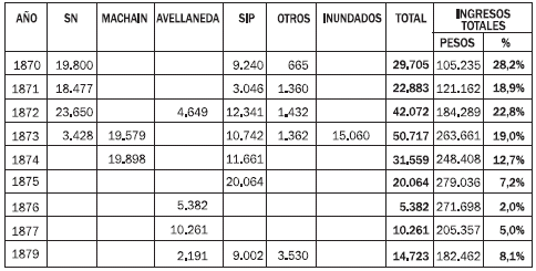 Entre 1856 y 1870, los ingresos por SN en la provincia oscilaban entre el 6 y el 20% (promedio, 13%), respecto del total del gasto público (Herrera, 2010, p. 204). En los años 1870 se distinguen dos etapas con respecto al SN, como se desprende del cuadro 6. Entre 1870 y 1873, el aporte descendió del 18 al 1%, para subir a 8% en 1874 (promedio, 12%) y luego desaparecer, como casi en todas las provincias, salvo en los cinco casos excepcionales.27