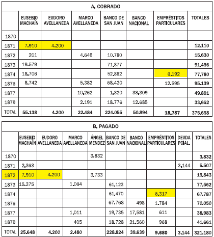 El análisis del cuadro 7 (A), permite verificar que los préstamos de Machaín de 1871 y 1873 fueron reembolsados por el Estado provincial (B), no así el de 1874. Lo mismo ocurre en los casos de los empréstitos de Eudoro Avellaneda y de Ángel Méndez. Respecto de Marco Avellaneda, los escasos valores pagados por el Estado (B) sí correspondían a dinero procedente de las cuentas de SN.28 Pero en ningún caso el Estado le reintegró los montos más importantes (A). Esto demuestra que, efectivamente, también formaban parte de los SN. Por lo tanto, Marco Avellaneda, más que prestamista, y como otra de las tareas propias de su función política, se ocupaba de administrar los fondos que le confiaba el gobierno nacional.29