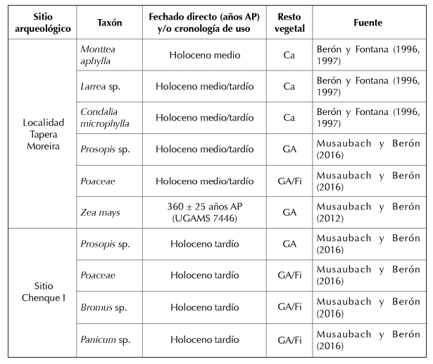 Los primeros estudios de macrorrestos vegetales correspondientes a contextos de cazadores-recolectores de la Pampa occidental permitieron identificar carbones del sitio 1 de la localidad arqueológica Tapera Moreira (STM) (Berón y Fontana, 1996, 1997). Mediante el análisis arqueobotánico de 12 muestras, se identificaron: piquillín (Condalia microphylla), mata sebo (Monttea aphylla) y jarilla (Larrea sp.).
