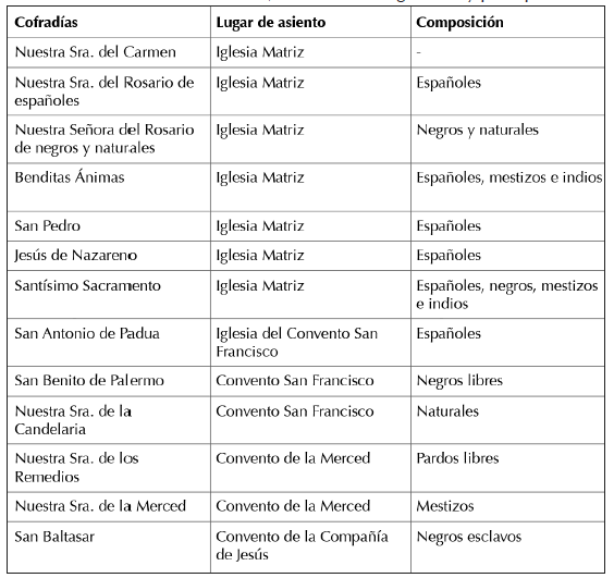 Cada uno de los grupos sociales y étnicos se adscribió preferentemente en algunas de estas asociaciones; mientras los negros, naturales y mestizos lo hicieron en torno a la de San Benito, San Baltasar, Nuestra Señora de la Candelaria y Nuestra Señora de la Merced; los blancos españoles se nuclearon alrededor de la de Benditas Ánimas, San Pedro, Jesús de Nazareno y Santísimo Sacramento. A pesar de tales preferencias, no fue extraño que los miembros de la elite estuvieran presentes en la mayoría de los cuadros directivos cofradieros, y que los negros, naturales y mestizos compartieran también con ellos, en calidad de hermanos, algunos espacios. Sin embargo, tales distancias no fueron infranqueables, pues a pesar de las notorias preferencias mencionadas, no fue extraño que los miembros de la elite estuvieran presentes en la mayoría de los cuadros directivos cofradieros, y que las castas compartieran también con ellos, en calidad de hermanos, algunos espacios.