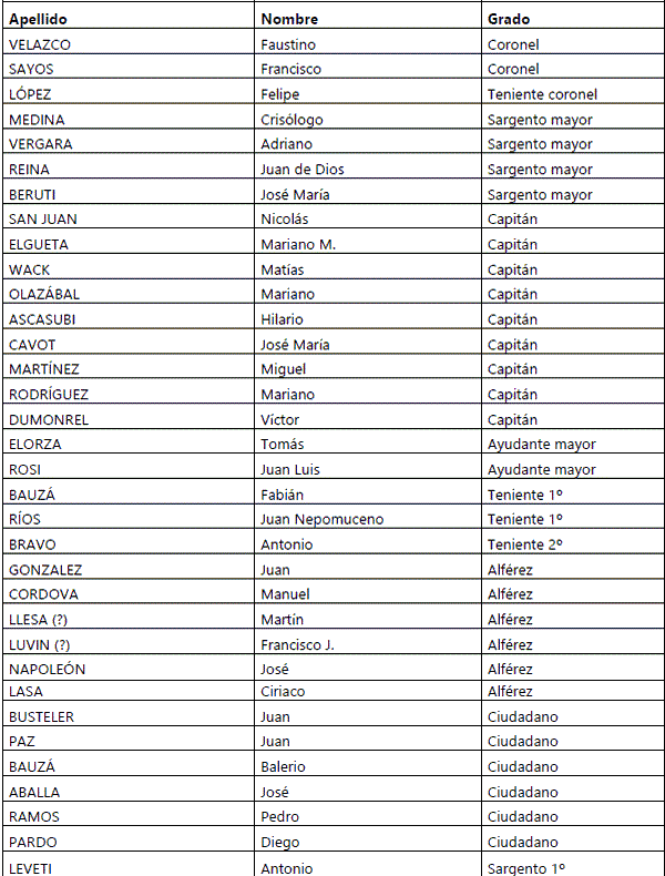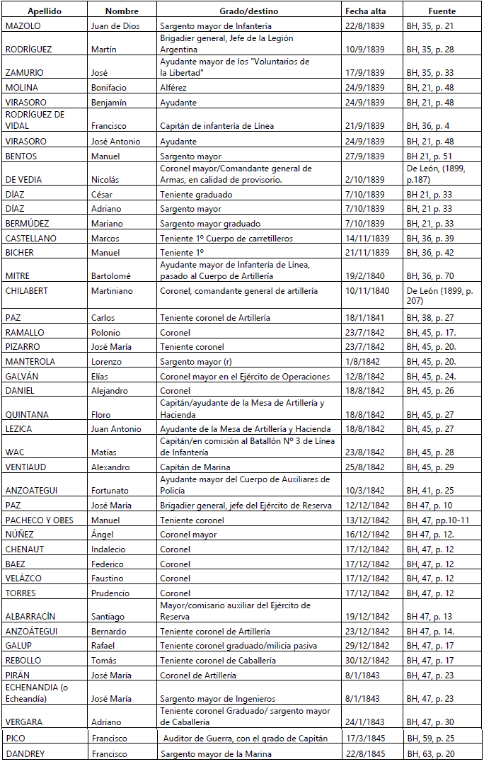 En ellas no constan otros soldados y oficiales, como el coronel Jacinto Estivao, de extensa trayectoria previa junto con Rivera, ni otras incorporaciones más episódicas e informales, como las del general Gregorio Aráoz de La Madrid, el exgobernador Juan Pablo López o los coroneles José Valentín Olavarría y Manuel Isidoro Suárez. Estas altas no necesariamente permiten hablar de un proceso acumulativo −dado que muchos se desvincularon del servicio pasado un tiempo−; antes bien, ellas parecen reflejar el papel que cumplió Montevideo como base de operaciones y espacio de permanente circulación de combatientes entre varios frentes antirrositas regionales, incluyendo el “retiro” a Río Grande do Sul, adonde muchos recurrían en busca de trabajo.