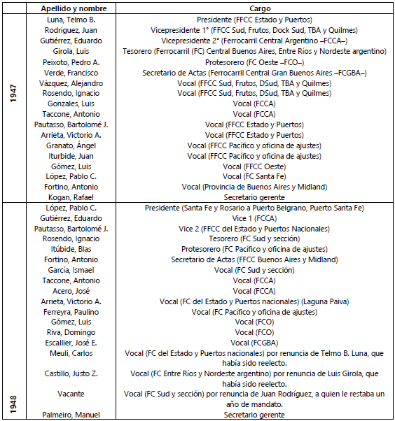 En este contexto se desarrollaron las elecciones generales en la UF. En agosto de 1948, con sorpresivas renuncias y jubilaciones de referentes con cargos directivos, se pusieron en funciones los nuevos integrantes de la CD. El desarrollo de las elecciones fue normal y no hubo grandes cambios entre los nombres de los delegados que resultaron electos, pues 12 sobre 17 eran los mismos del año anterior. Sin embargo, una vez reunido el cuerpo para distribuir los cargos, se produjeron bruscos e inusuales movimientos. En primer lugar, tuvieron lugar variaciones importantes en la dirección del gremio. Tres miembros de la mesa directiva (sobre cinco en total) –quienes habían estado firmemente comprometidos con la defensa de la caja de jubilaciones del gremio– renunciaron: Telmo Luna (expresidente), Luis Girola (extesorero) y Juan Rodríguez (exvice 1°). Los primeros habían sido recién afirmados por el voto de sus seccionales, al tercero le quedaba un año en funciones, por lo que dejó el cargo vacante a mitad de mandato. Sumado a ello, hubo también dos cambios importantes en la comisión administrativa. El único secretario gerente que había tenido el sindicato en 25 años, Rafael Kogan, se jubiló y su lugar fue ocupado por Manuel Palmeiro. Por último, Luis Gonzales (quien había sido presidente del sindicato hasta que renunció al cargo para ocupar funciones en el Instituto Nacional de Previsión Social, a fines de 1944) también se jubiló intempestivamente y abandonó su vocalía en la CD. Parecía que toda una facción desertaba del cuerpo directivo del gremio en una acción consensuada (ver cuadro).