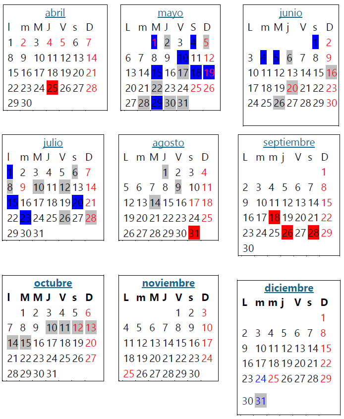 Nota: Calendario del año 1901. Resaltados en gris claro y en azul los días en que se reporta realización de escritos y de recopilaciones de Nahuelpi, respectivamente. En rojo, ocasiones de dictado de textos a Lehmann-Nitsche.