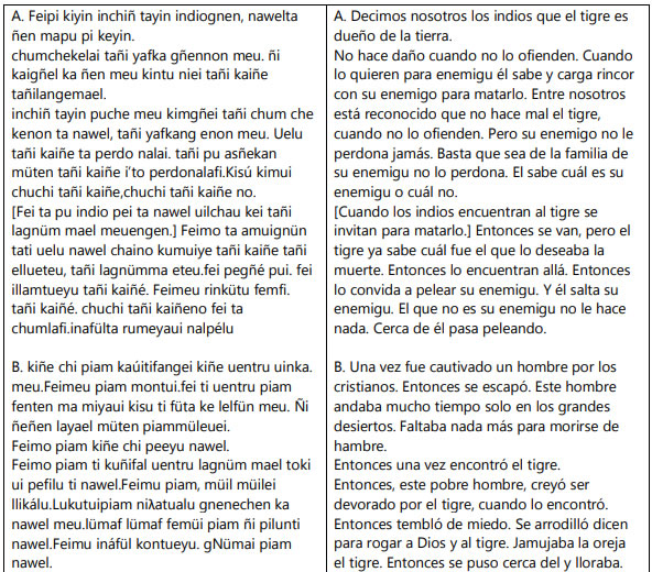 En tal sentido, Nahuelpi se construye como enunciador en la perspectiva de un oralitor, más que desde un productor escritural solitario. En el texto siguiente, denominado gNütam montun uentru/Historia del tigre con el hombre (“Literalmente: Historia como se escapó un hombre”, según Lehmann-Nitsche), se exponen –en su organización, contenido y recursos discursivos– las distintas aristas de la tarea emprendida por Nahuelpi. Por un lado, este carácter de multiplicador de voces conocidas previamente, en tanto el texto se inicia con la siguiente adscripción: “Nah. scripsit. Lo ha oído decir de su padre”, y en su enunciación toma como referencia en la comunidad: “Decimos nosotros los indios”, “Entre nosotros está reconocido”. Por otro lado, la parte A, constituye una introducción “científica” al tema que expone los distintos comportamientos del tigre ante los humanos según los saberes del pueblo mapuche. La parte B, que compone la primera versión documentada hasta el momento en el país del Nawel Ngütram, relata el regreso a su tierra de una persona desplazada, con el auxilio del tigre durante esa travesía. El texto sigue los patrones retóricos de los ngütram relativos a la época del awkan y del Nawel ngütram en particular (Golluscio, 2006), y se infiere una organización discursiva originada en la oralidad que se traspone a la escritura, estructurada secuencialmente con base en el conector feimu –‘entonces’– y con asignación de autoridad enunciativa por medio de piam –‘dicen’–. Cabe destacar que, en relación con este relato, Nahuelpi se enfrenta con el antropólogo y se posiciona inmediatamente contra el carácter ficcional que Lehmann-Nitsche (1902, p. 281) le atribuye, en tanto su competencia metadiscursiva le permite detectar el error epistemológico de catalogar como un “cuento”, el relato de una situación considerada sucedida o verosímil, desde la perspectiva del pueblo mapuche.