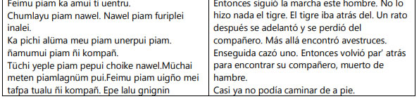 Mari pichi lamgen Cheme gone chen kai tañi piemeu ta peutuiyu kiai te. pichi langen. yto chungechipe kisu peiafin chei pikeullen maelpikelu inche.24 [Buen día, hermanita, ¿Qué Dios habrá querido que lo [nos] víamos, hermanita?¿Cómo podré verla sola? sabía decir yo.]